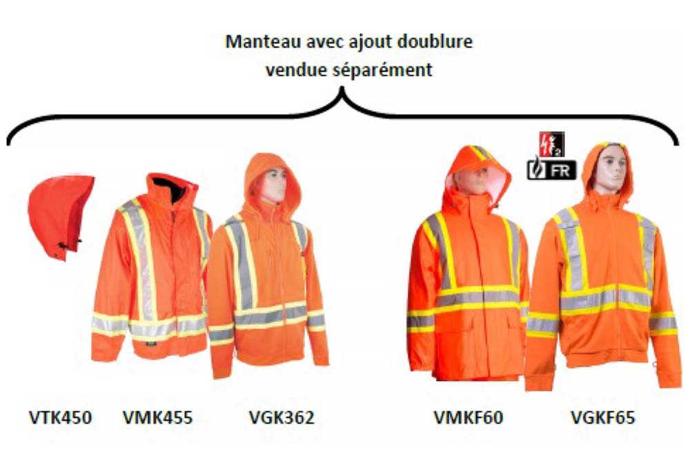 Lors de journée pluvieuse, les habits de pluies, comme le VMK455 présenté plus bas, sont parfaits pour être enfilés par-dessus une veste en polar qui agit à titre de doublure. Lorsque la pluie cesse, le travailleur peut continuer à travailler avec seulement sa veste sans devoir porter un gros manteau imperméable. En situation contraire, s’il continue à pleuvoir et la température se réchauffe, il est possible d’enlever la doublure en polar.