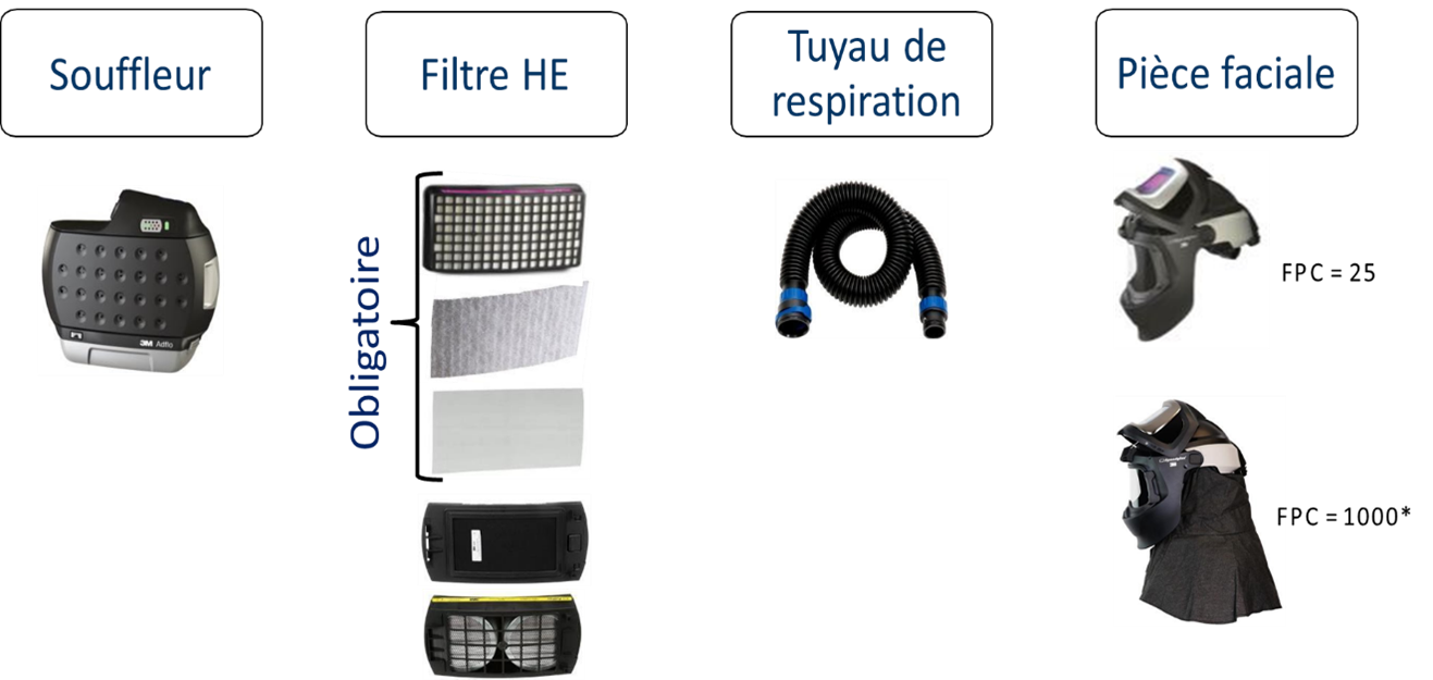 L’utilisation d’un système PAPR est fréquente en soudure. Un appareil de protection respiratoire d’épuration d’air propulsé (PAPR) est un type d'équipement respiratoire de protection individuelle conçu pour protéger les travailleurs contre l'inhalation d'air contaminé.