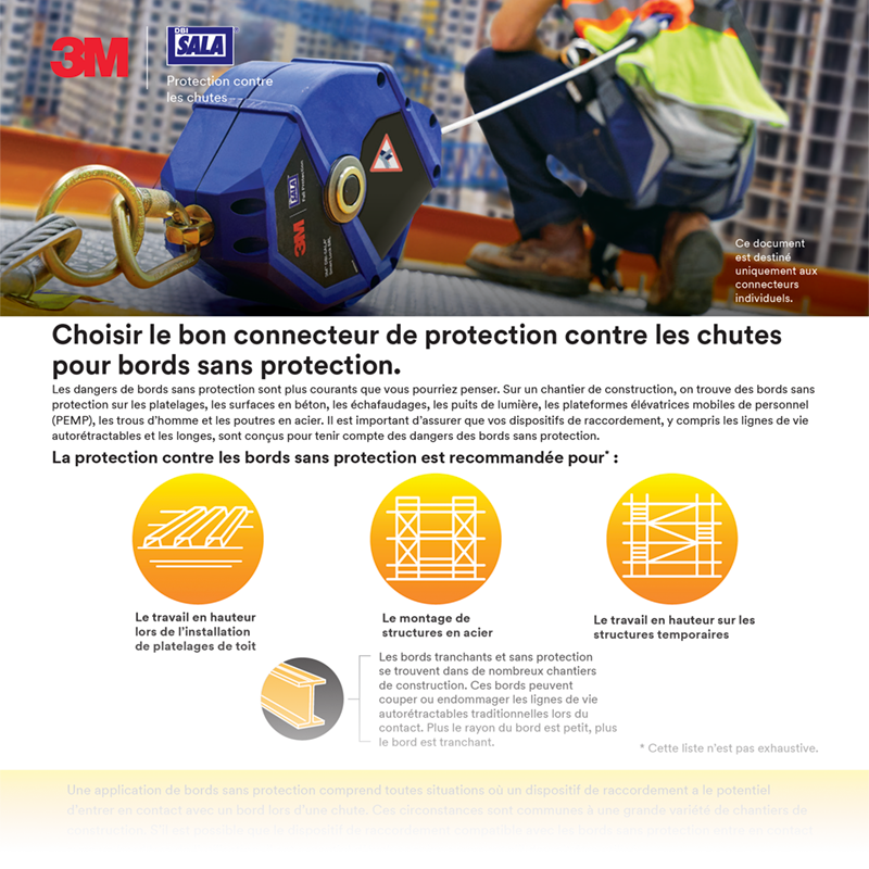 Pour vous assurer de ne pas rencontrer de problème lors de travaux avec des bords d’attaque, 3M vous offre une gamme de lignes de vie auto-rétractables conçues spécialement pour résister aux rebords tranchants. Ces produits respectent tous la norme CAN/CSA Z259.2.2 pour bien répondre aux besoins très spécifiques des travaux avec bords d’attaque.