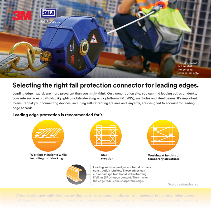 3M offers a range of self-retracting lifelines specially designed to withstand sharp edges to avoid issues when performing work at heights near leading edges. These products comply with the CAN/CSA Z259.2.2 Standard to better meet the particular needs of work performed around leading edges.