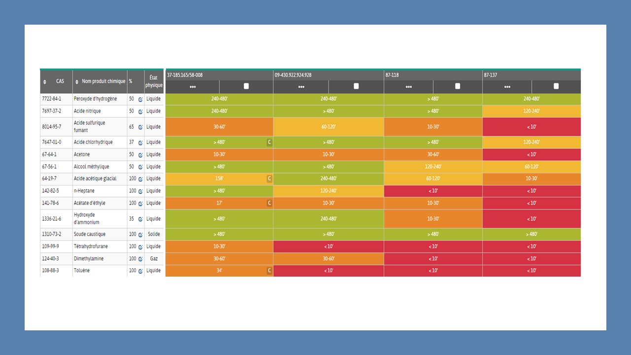 *Vous trouverez le tableau de résistance aux produits chimiques de ces produits à la fin de l'article
